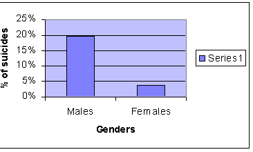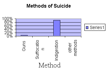 We found that suicide is a growing problem amoong many people. The most common method of suicide is self-inflicted gunshot. The second most common method of suicide was suffocation. Ingestion of poison or oberdose of polls os the third most common mehtod. Males are five times more likely than females to actually commit suicide. Native Indians have the highest suicide rate. We have found that the reason for this is the lack of respect for Native-American history in public schools cause's young people of the ethnicity to feel alienated and commit sucide. Another reason is due to the suppression of their religion and culture by the Federal Government. African-Americans have the lowest suicide reate. We believe that people commit suicide because of racial reasons however others have their own reasons for their suicide.