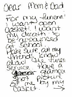 Suicide is the taking of one's own life. We think suicide is a very important issue in the United States and should be taken seriously. Many people don't think suicide is an important issue but really it is a disease to human society. We as a team are striving to get true facts about suicide out to the public by providing an in school coundeling program for teens and adults of all ages who suffer from this form of self-destruction.