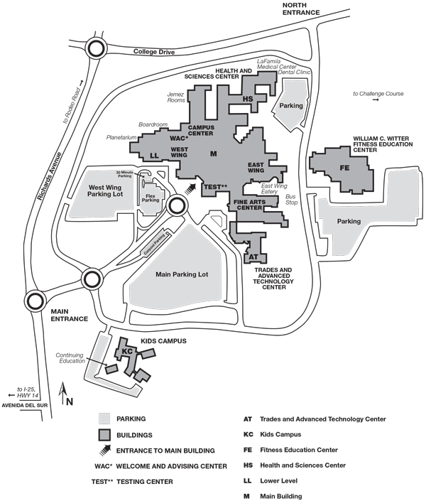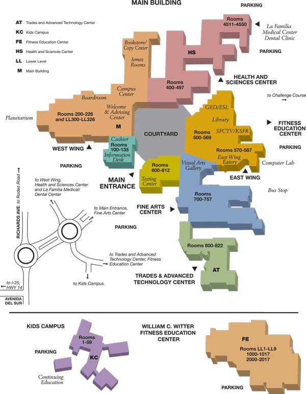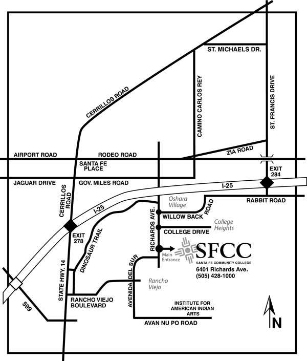 If you are coming from the south on I-25 into Santa Fe, exit on 599 south and turn left onto Highway 14. Turn right on Rancho Viejo Boulevard, left on to Ave Del Sur, and left on to Richards Avenue until you reach Santa Fe Community College at 6401 Richards Avenue.